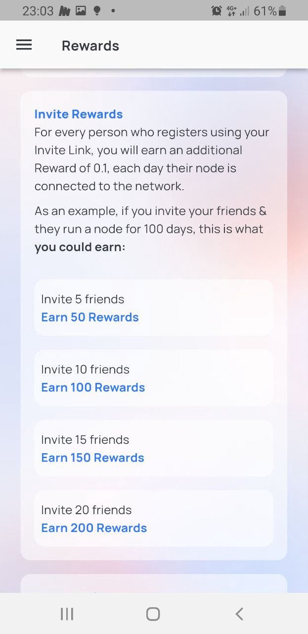 Каждый день вы зарабатываете 1 токен Mina, и если вы приглашаете кого-то создать свою поощрительную учетную запись по вашей пригласительной ссылке, вы зарабатываете 0,1 токена каждый день, когда приглашенный человек майнит.