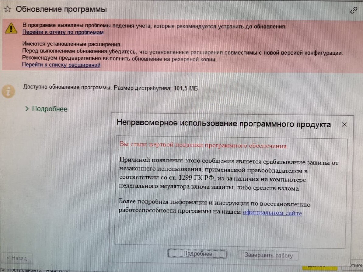 Неофициальная версия: в обновлении платформы какой-то косяк. Пользователи неоднократно сообщают о том, что у них на абсолютно новой системе стоит совершенно лицензионный набор софта 1С, а сообщение всё равно появляется.