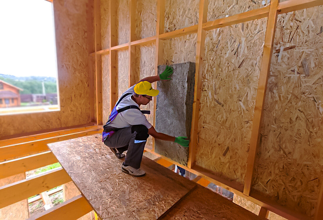 В процессе строительства каркасного дома работники должны выполнить утепление стен.