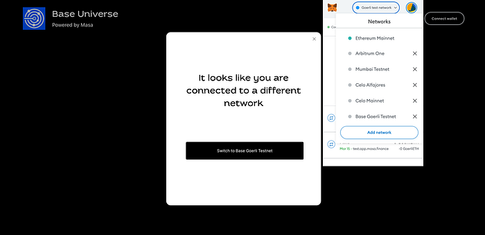 - Перейдите на baseuniverse.masa.finance . При входе в систему вам будет предложено переключить сеть с Goerli Testnet на Base Goerli Testnet.