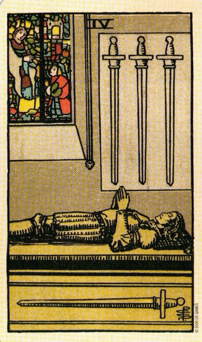 В одном из гаданий, где мы разбирали проблемы с питанием и лишним весом, в позиции «препятствие» у кверентки выпала Четвёрка Мечей. Сразу появилось ощущение, что карта здесь говорит не только о том, что мешает, а скорее как совет, как можно это преодолеть, как будто это подсказка.