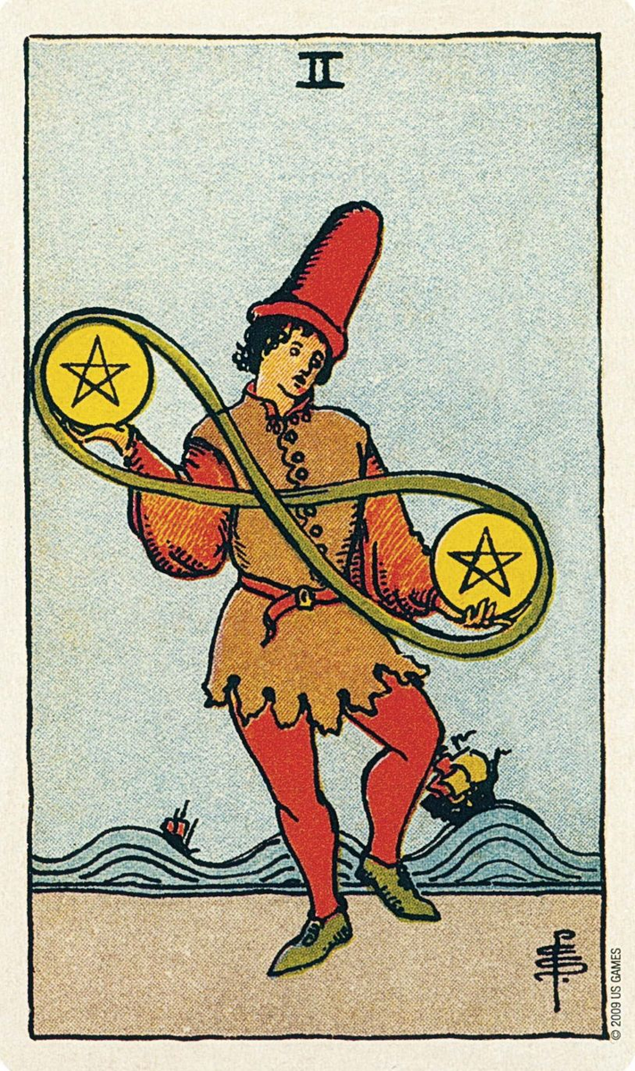 Если в раскладе на отношения, допустим когда сторона А спрашивает о чувствах и намерениях стороны Б, выпадает 2 Пентаклей, я всегда говорю: не нужно её романтизировать и приписывать ей глубокий смысл, что это красивый «баланс приоритетов» и гармония. Здесь осознанной гармонии. Это жонглирование.