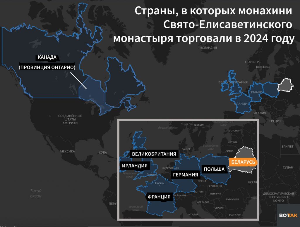 Польша — не единственное направление коммерческой деятельности минского монастыря. «Вот Так» изучил все упоминания Свято-Елисаветинской обители в открытых источниках за последний год. Оказалось, что торговля идет не только в Европе, но и в Северной Америке, а основные партнеры минского монастыря — католические приходы и благотворительные организации.