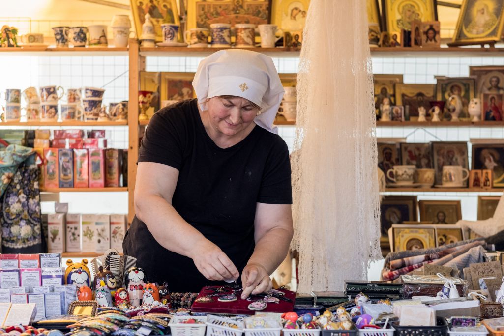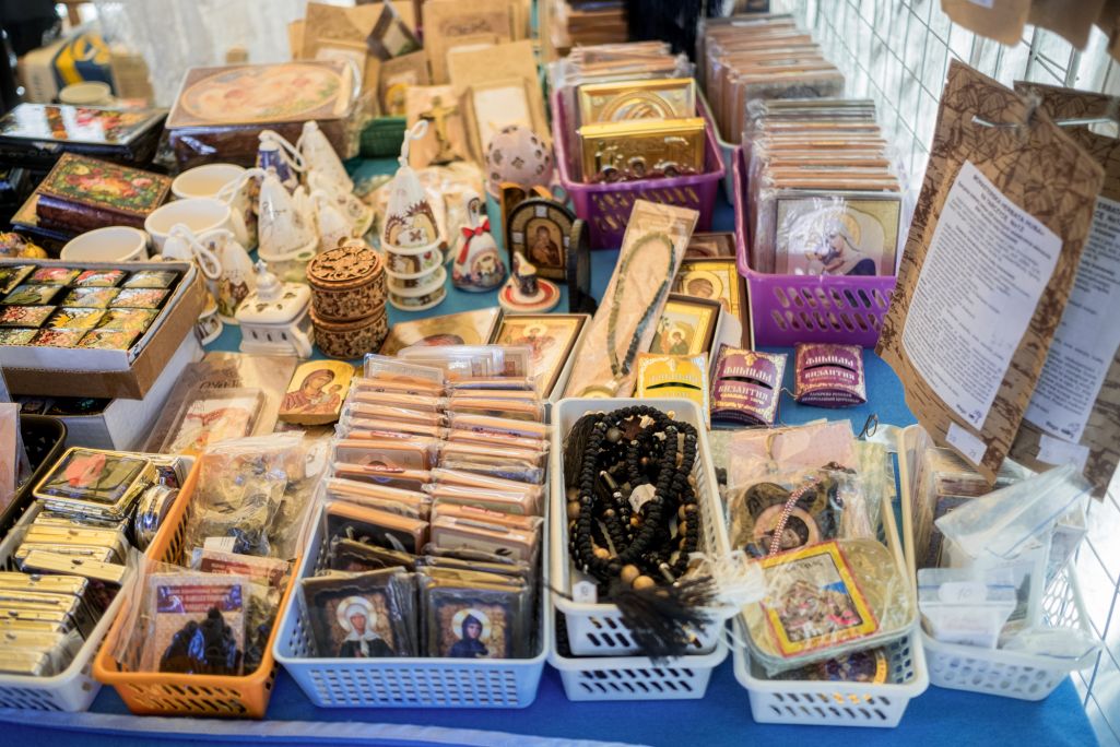 Благодаря сестре Ирене, палатку удалось найти быстро. За прилавком — женщина в возрасте 50+ в белой косынке. Напротив нее аккуратно разложены препараты из каталога, а еще иконы, платки, посуда, украшения, шкатулки и матрешки. О том, что это продукция Свято-Елисаветинского монастыря, написано только на упаковке товаров. Видно, что они пользуются спросом — в отдельные моменты возле палатки образуются небольшие очереди.