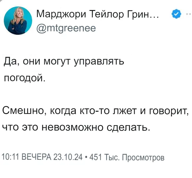 И да, Марджори Тейлор Грин (@mtgreenee) подтверждает то, что мы уже знали ... вы можете контролировать погоду. "Это смешно, когда кто-то лжет и говорит, что это невозможно".