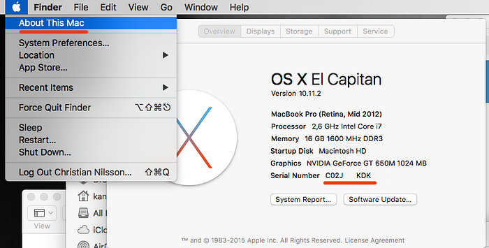 Asking the serial number of a used MacBook is the first thing you have to do as it can give you very important information about the computer. You can check it by clicking the Apple logo on the upper-left of the MacBook and choose About This Mac. You can also check it on the bottom of the Mac. What to do after you get the serial number?