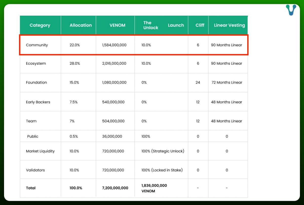 Всего 22% изначального предложения $VENOM выделено для сообщества. На мой взгляд, эти токены могут быть использованы в качестве стимулов для привлечения большего числа пользователей в сеть Venom.