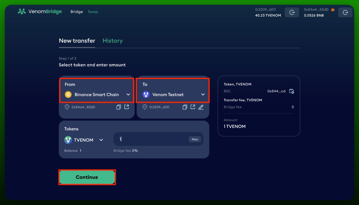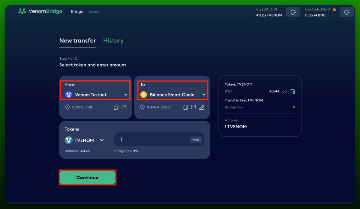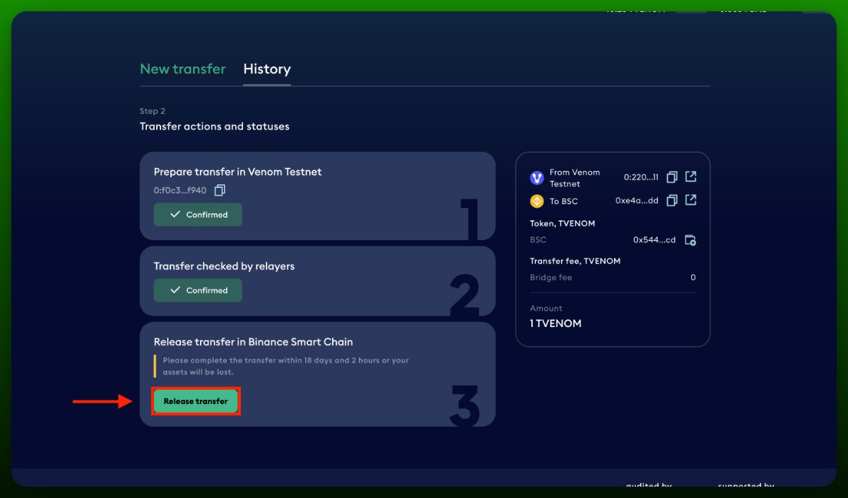 • Переведите любую сумму из Venom в BSC