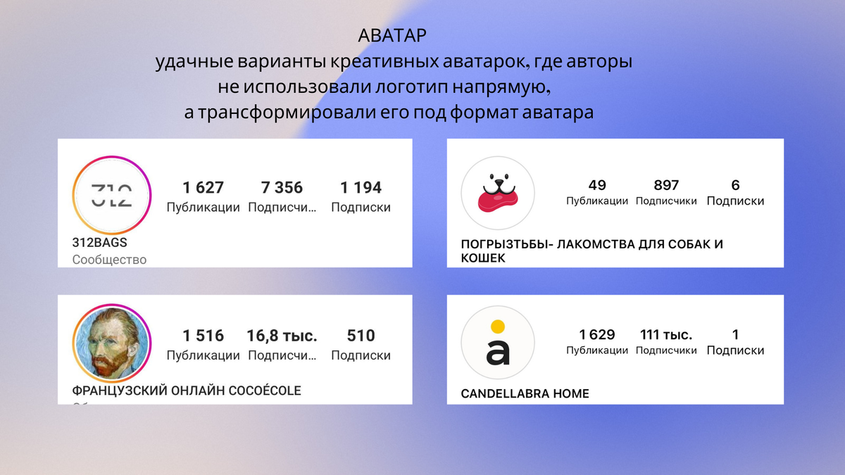 Бывает, что название бренда и сам фирменный логотип очень длинный, в таком случае лучше сократить его до инициалов или поставить на аватарку самую узнаваемую деталь.