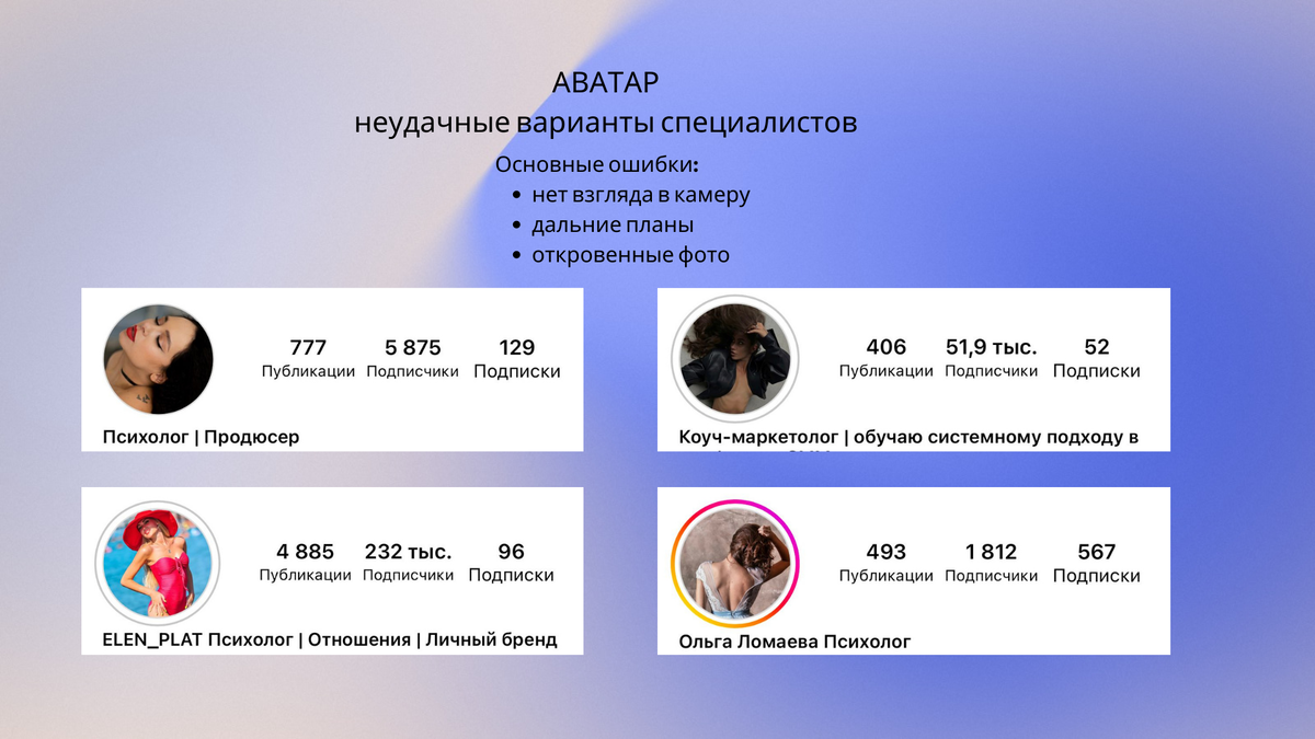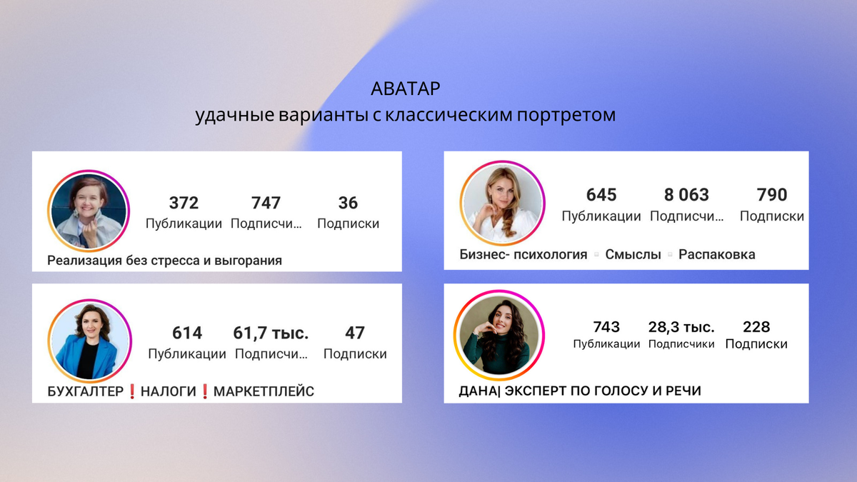 Аватар – это ваш первый контакт с аудиторией, взгляд должен быть направлен в камеру, контакт «глаза в глаза» вызывает доверие.