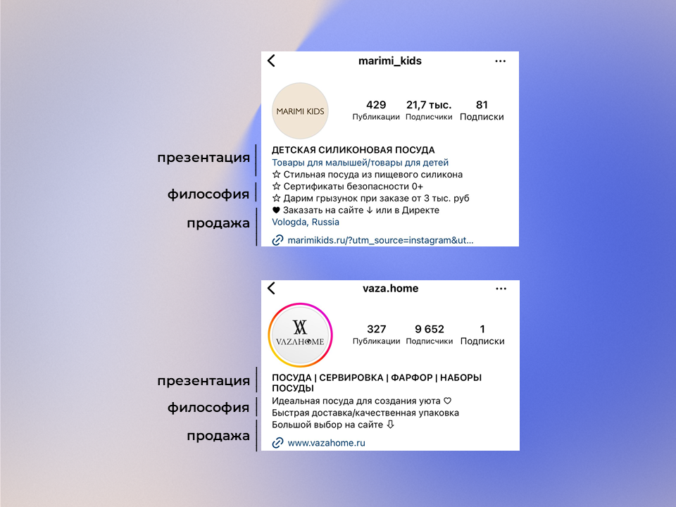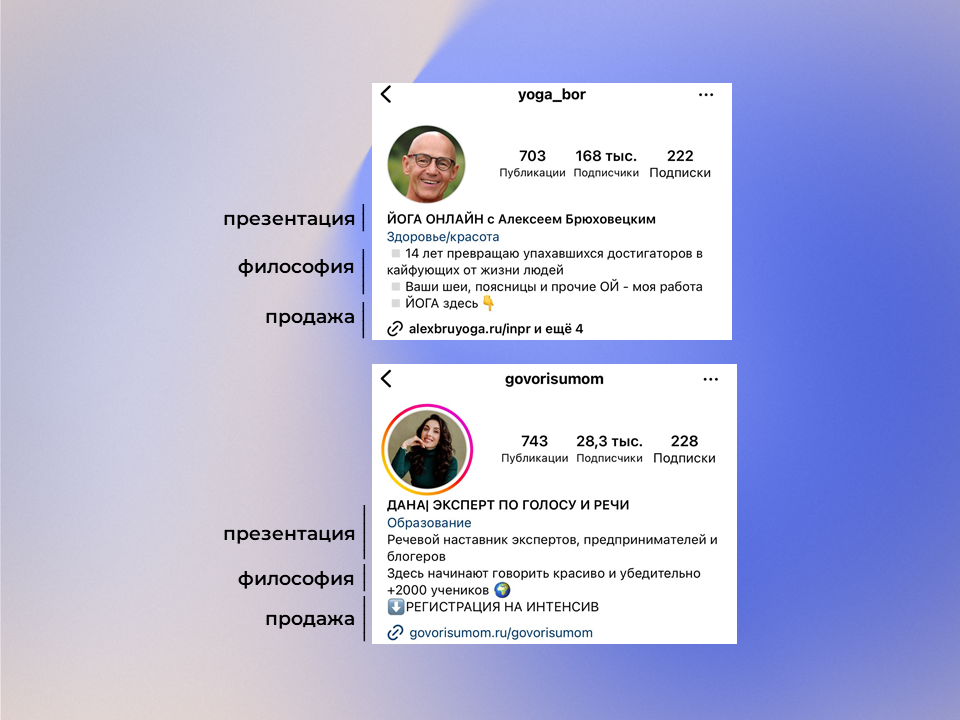 Основную часть био профиля мы рекомендуем заполнять по принципу трех блоков: презентация, философия, продажа. Это условное деление. В блоке презентации вы презентуете себя (представляетесь именем или презентуете проект), в философии выражаете свою основную идею, рассказываете что и для кого здесь предлагается, и блоком продажа побуждаете к действию (призыв к действию, как правило, ведет на ссылку, реже - на актуальные сторис)
