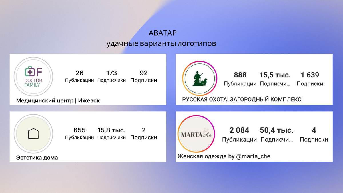 Логотип больше подойдет для бизнес-аккаунтов с несколькими владельцами и большой командой. Например, из сферы розничной торговли (магазин одежды, косметики, товаров для дома и т.д.), профессиональных услуг (салоны красоты, организации праздников, организации общественного питания и т.д.).