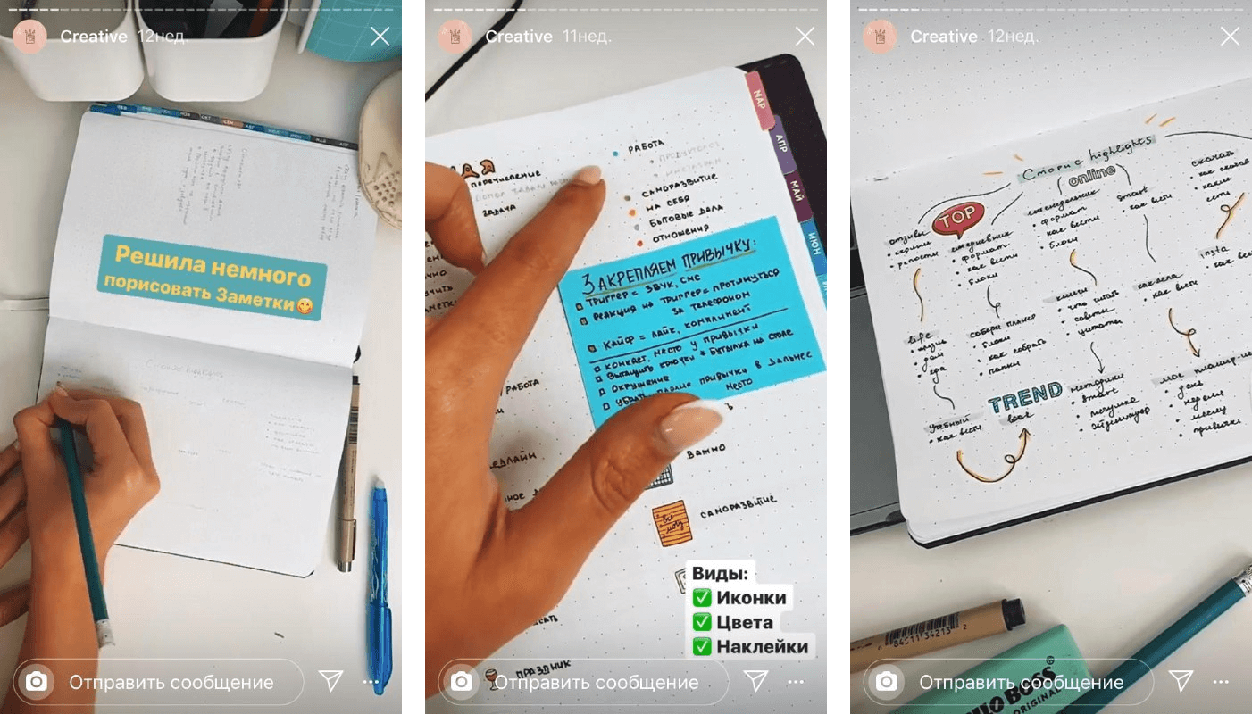 Если продаете, например, скетчбуки, то в Историях можно дать примеры заполнения или показать, как вы сами это делаете: