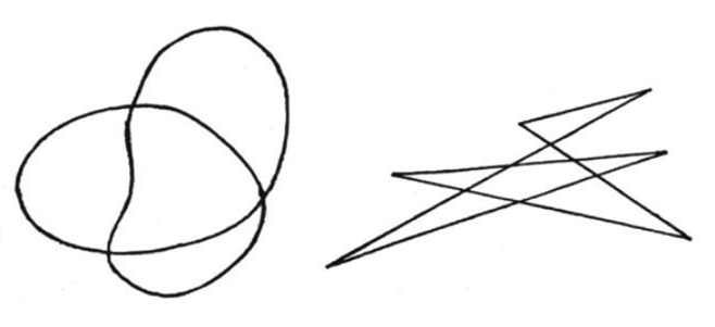«Исследователи обнаружили, что мы тесно связываем звуки и изображения, даже если не понимаем само слово. Вот для примера тест, взятый из исследования Вольфганга Кёлера. Какую из фигур можно назвать "малума" а какую "такете"?