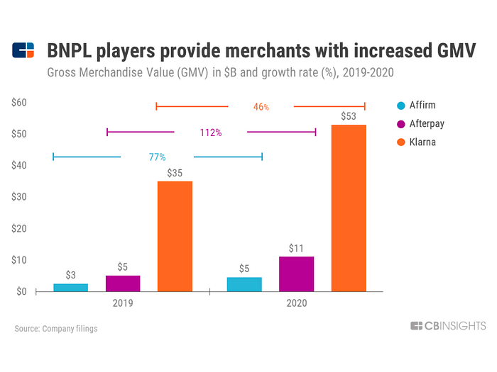 Показатель валовой товарной стоимости (GMV), представленный на приведенной выше диаграмме, в основном представляет собой остаток по кредитам клиентов ведущих финтехов BNPL.