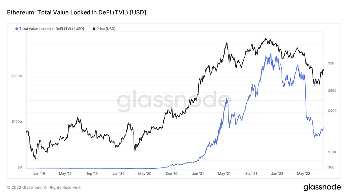Хорошим показателем использования является Общая заблокированная стоимость (TVL) в приложениях DeFi (т.е. сумма средств, которые пользователи припарковали или “поставили” на платформах DeFi, за которые они получают доход взамен).