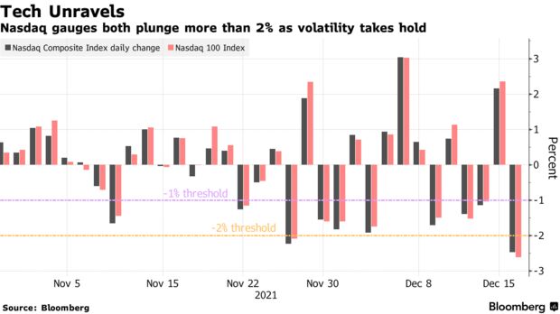 MSCI Inc.’s Asia-Pacific index was down for the fifth session in six, with Chinese tech stocks sliding more than 2%. U.S. and European equity futures were in the red after the Nasdaq 100 sank the most since September. The Federal Reserve’s pivot toward reducing outsized stimulus has sapped investor ardor for the more richly valued tech plays that dominate the U.S. gauge.
