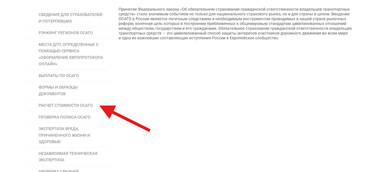 После выбора раздела «ОСАГО» выберите в списке слева опцию «Расчёт стоимости ОСАГО».