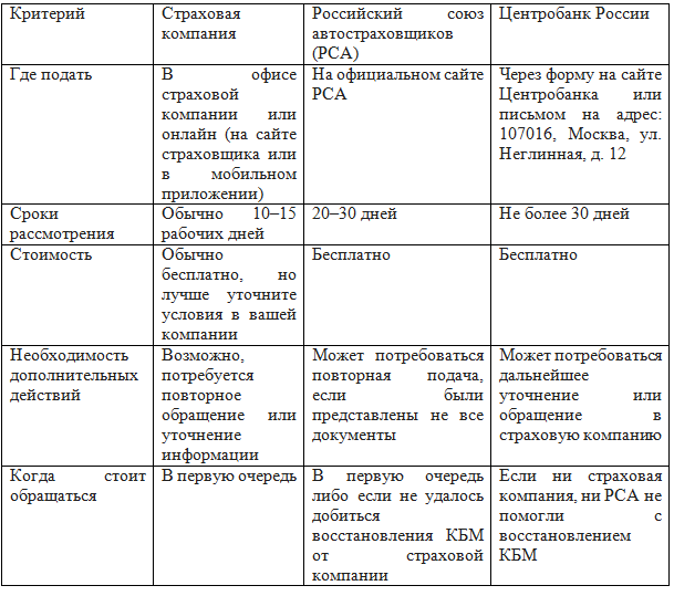 У каждого способа восстановление КБМ есть свои недостатки и преимущества. Чтобы было легче понять, в какую инстанцию лучше обратиться, привели сравнение вариантов в виде таблицы.