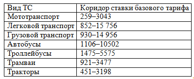 Коридор базового тарифа установлен приложением 1 указания Центробанка. Ставки тарифа различаются в зависимости от вида транспортного средства и ряда его характеристик. Также свои коридоры установлены для такси, общественного транспорта, тракторов.