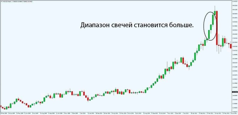 Сильное трендовое движение обычно возникает, когда рынок находится в долгосрочном восходящем тренде, и цена внезапно начинает двигаться вертикально вверх. Диапазон свечей становится намного больше по сравнению с предыдущими свечами. Когда так происходит, это верный признак того, что умные деньги спешат выйти из рынка, а большинство трейдеров открывает новые сделки на возрастающей волатильности. Все это говорит о том, что тренд близок к своему завершению.